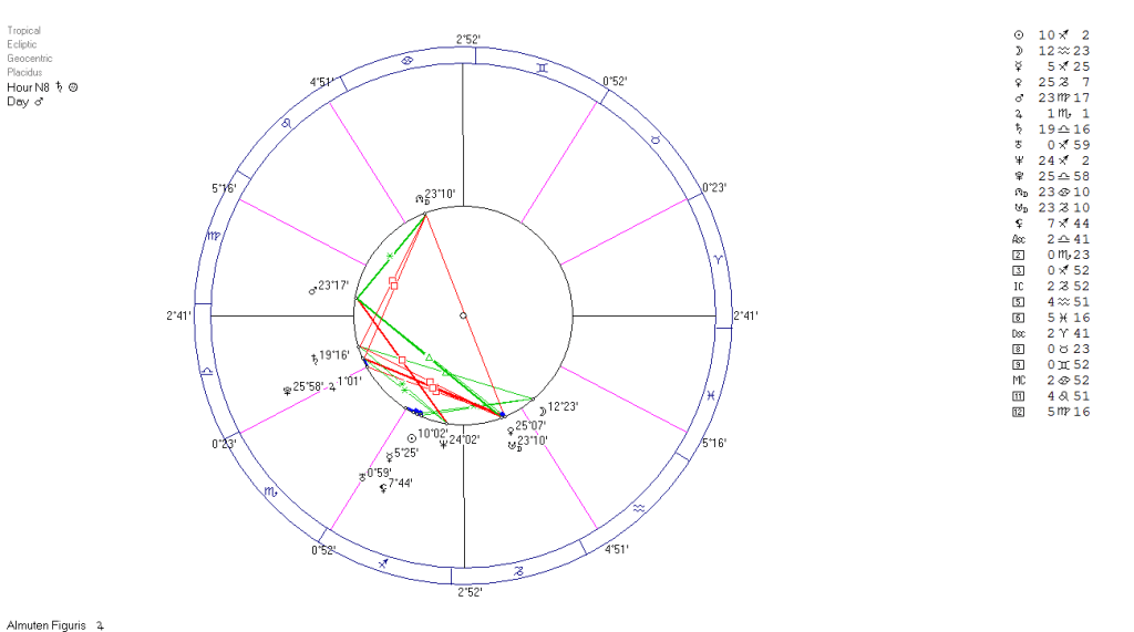 Moon in Aquarius can be chilly, (or cool) it is in her fifth house of creativity and children, but it is freedom loving, forward looking, barrier breaking, technology using, humanitarian. Her Cheiron (not shown) is at 19’Taurus 23′ in the eighth house.