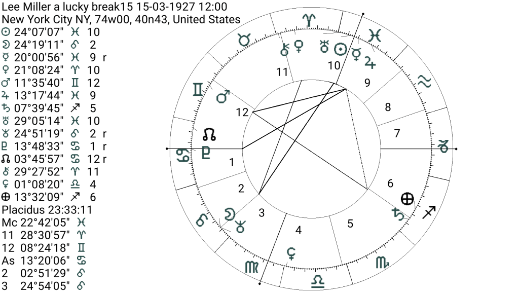 She then went to Paris and turned up at Man Ray’s studio announcing she was his new pupil. He replied that he didn’t take students and was going to Biarritz, she said she was going there too. Her Aries Mercury on the descendant meant she was able to talk almost anyone into giving her what she wanted. Mercury in Aries is the super persuader who does not take no for an answer and has tremendous self belief. Lee worked with him and later became his lover. He photographed her many, many times as if trying to understand her, but with an eighth house Sun she was both elusive and unknowable.