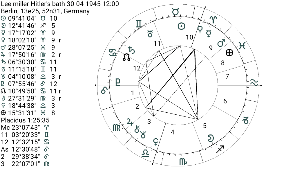 Neptune, the planet of photography was almost exactly conjunct her Ascendant at 4’24 Libra that day and opposite her fearless and provocative Mercury in Aries, while Saturn was conjunct her Midheaven at 6 Cancer. Although we don’t know what time the photo was taken, it was after they had visited the Death camp at Dachau because Lee deliberately trod the dirt of the camp throughout Hitler’s apartment, so I am guessing it was evening time. The Moon was in Sagittarius (the truth teller) applying to conjunct her natal Pluto at 22 degrees, the perfect symbolism for a trip to hell followed by an expose. Lee said her intention was to document the Nazi atrocities to give an eyewitness account of the war. The images reflect the incontrovertible evil of the holocaust. They were used in a broadcast by Ed Morrow and Richard Dimbleby inside Bergen-Belsen death camp, to prove to people the horror which had happened there. Many of the hundreds of photographs she took can be seen on her website, www.leemiller.co.uk set up by her son Anthony Penrose.