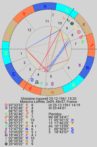 The Moon, in a horoscope can show the childhood of the native. Moon in Leo gives luxury, extravagance, the adored child. Ghislaine was the baby of the family and a brilliant child, her father’s favourite. The Moon is separating from an opposition of Jupiter in Aquarius conjunct the MC and they both square Neptune in Scorpio in the 6th forming a Fixed T square. We can take the Jupiter as her flamboyant father Robert Maxwell, the self-made millionaire newspaperman, who dined with royalty and lived an extravagant and perhaps debauched life. When a Jupiter is peregrine (without dignity) it shows the negative aspects of the sign and planet. In this case reckless expansion (Jupiter) and tyrannical behaviour (Aquarius). Both planets in square to Neptune in Scorpio in the 6th, emphasize the deceitful, manipulative, and power-hungry theme of her Sun, Mercury, Mars.