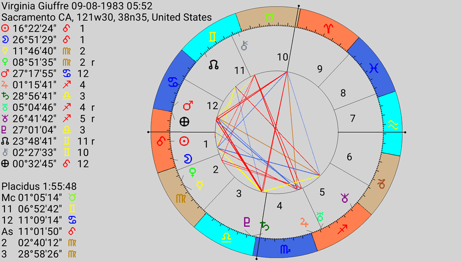 Speaking of justice, Giuffre has a fine Jupiter in Sagittarius, ruler of the 9th house of law and justice, conjunct Uranus the wrecker. Jupiter gives hope and luck, although arguably her early life was anything but lucky. The Jupiter Uranus is part of a mutable T square, opposite Chiron in the 10th (those wounds given by the powerful) square a Venus, Mercury conjunction in Virgo in the 2nd. The Venus in the 2nd does suggest sex (Venus) bought and sold (2nd) and transported (Mercury). Venus rules her MC again showing these powerful men, who abused her. Chiron square Mercury does suggest the wound (Chiron) of not being believed (Mercury) and being silenced by the powerful (10th). Jupiter Uranus works out on a massive scale, Giuffre has exposed these crimes, bringing them into the public domain, even if few people have been punished to date.