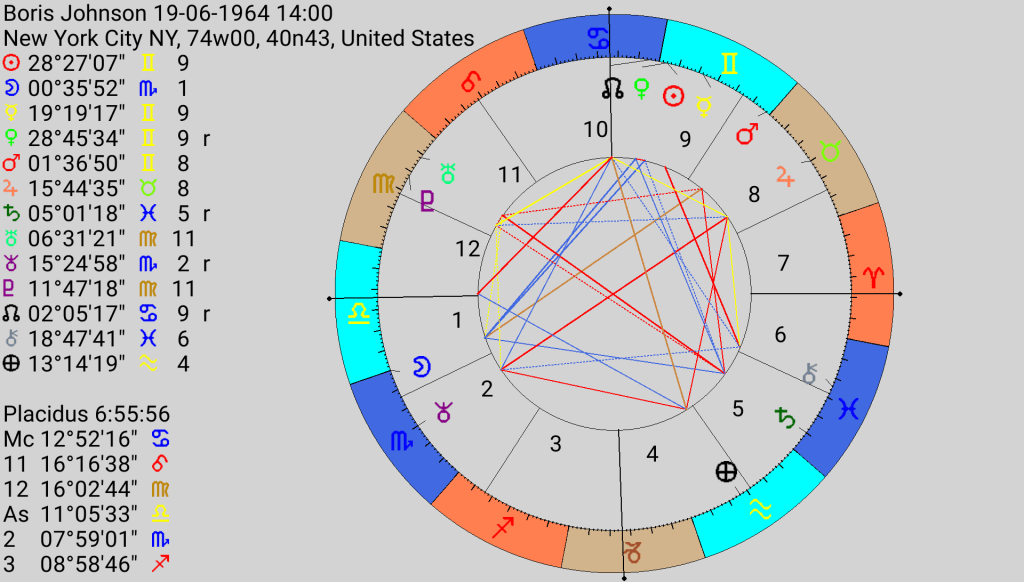 Which brings us to our current leader. Without the anchoring of Blair’s Taurus Sun, Boris gives us a more chaotic and mendacious expression of Air. Boris is also using war to bolster his extremely precarious position. A friend and supporter of Ukraine, this time on the side of the oppressed, Boris sees himself as a Churchillian figure who will save the day. Libra rising makes him a charmer, also gives him a fine mind, while Sun, Mercury and Venus in Gemini in the 9th show his mutability, which suggest both flexibility and fickleness. These are trine his Part of Fortune in Aquarius again indicating mental acuity and an autocratic tendency. While Blair may have had the one big lie, Boris has had a multiplicity of them. Lying to Parliament, the Queen, the people, the police, his fellow MPs, he was sacked twice having been caught out lying. For such a prodigious liar he seems singularly bad at it- or perhaps he simply doesn’t care. His legacy, Saturn weak in Pisces is part of a water Grand Trine of Moon in Scorpio in the 1st, and North Node and Midheaven in Cancer. Saturn is opposed by an Uranus Pluto conjunction in Virgo (all those details Boris is so contemptuous of) and square an aggressive Mars in Gemini making a Mutable T Square. After a heady election win, Boris’ tenure has been endlessly marred by his laziness, corruption and dishonesty- his legacy will be more tarnished than Blair’s, but with a deal less blood on his hands. Currently, Uranus is aspecting his greedy Jupiter in Taurus in the 8th house of power and subterfuge. The first hit was May 21st, when he met with civil servant Sue Grey before she published her report into ‘partygate’. We do not know what transpired but likely he endeavoured to influence her, he is her boss after all. The second hit will be on the 9th of December and the final transit is on the 7th March 2023 which will coincide with his second Saturn return. Jupiter rules his 6th house of health, he does not look well it must be admitted and his 3rd house of siblings and neighbours, will one of them be the architect of his downfall? Rishi Sunak, the Chancellor is his neighbour at no 11, although he too, is tarnished goods. Boris has a carefully constructed image (Libra) of a shambolic cheeky chappie, but his Scorpio Moon shows a shrewd and ruthless operator who will hold on till the bitter end, happily throwing anyone under the bus to protect himself.