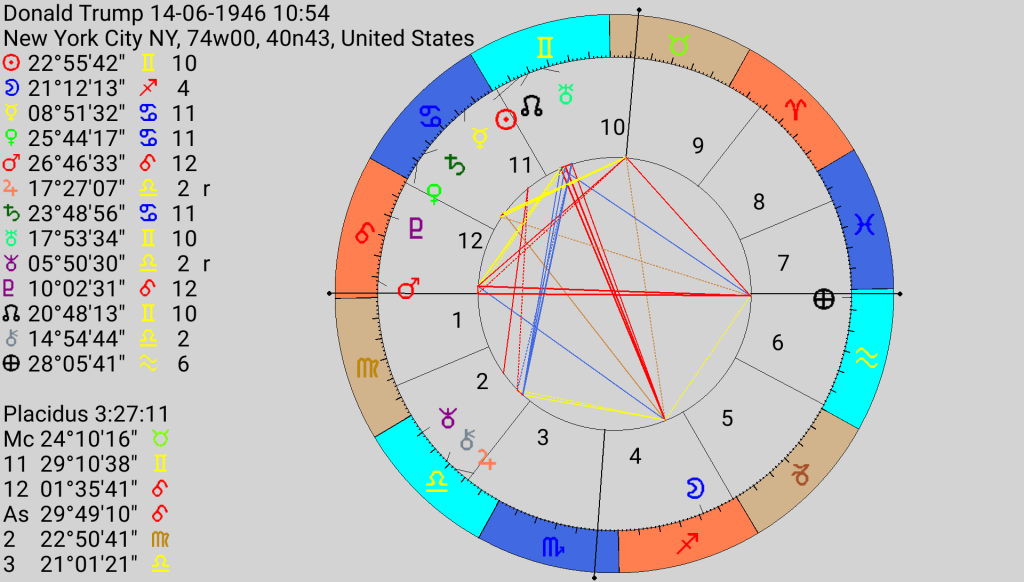 The final villain of the piece, demonstrating that everything is more extreme in the USA, is Donald Trump. Another Mars rising, this time in Leo. He also has a wide Grand Trine in Air; Jupiter Chiron in Libra in the second, trine Sun, North Node and Uranus in Gemini in the 10th, trine Part of Fortune in Aquarius conjunct the descendant. Of course, Trump’s big lie, currently under investigation, is bolder and more outrageous than Blair’s or Boris’, although he comes second in the blood letting stakes, is the claim that he won the election. His advisers, they now say, repeatedly told him he had lost, there was no fraud, but Leo is ever the sore loser and massive sulker. Whether he believed the lie or was intent on imposing his will on the people, he backed the insurrection implicitly and perhaps explicitly. People died and a Rubicon was crossed with who knows what terrible long term consequences for the country and its beleaguered democracy.