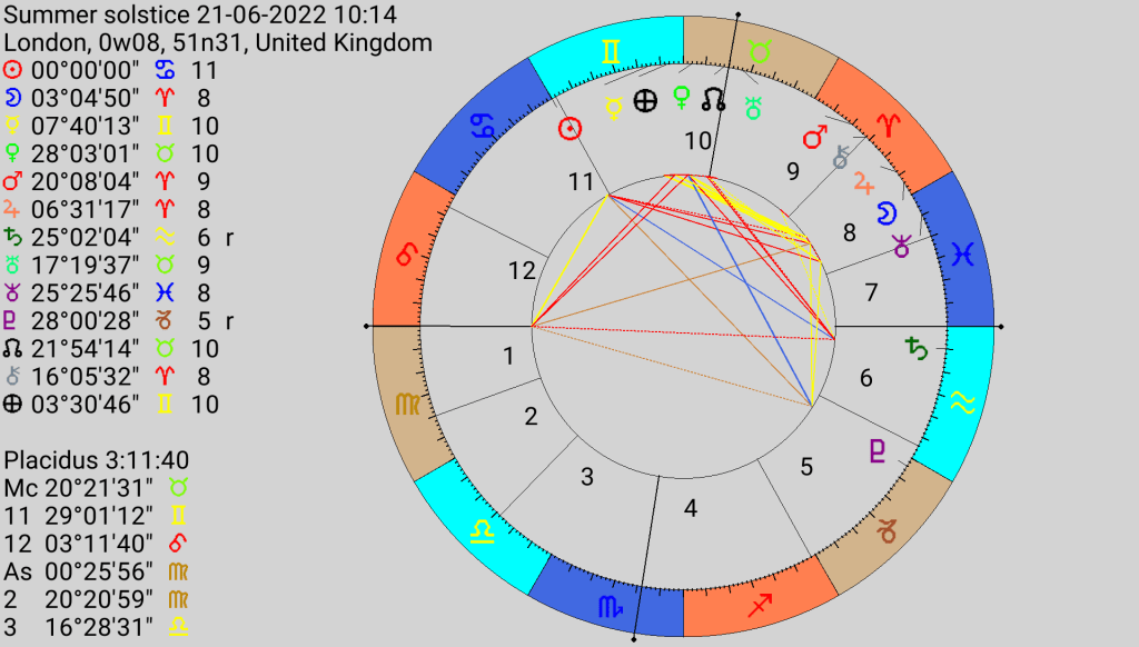 The Summer Solstice chart shows the government (10th house) as Taurus conjunct the North Node and Uranus moving towards that conjunction which is not exact for another year (June 4th 2023, also the day of a New Moon at 13′ Sagittarius). The ruler of the 10th is Venus strong in her own sign but void of course (making no aspects until it leaves the sign) separating from a trine of Pluto ruler of the 4th representing the opposition to the government. The strong Venus shows the past (void of course), the government had a strong mandate from the people in the last election, a majority of eighty. But it is fatally wounded (separating from Pluto).