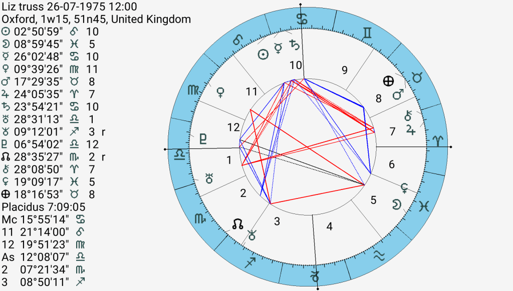 Liz Truss had another bruising week with protesters interrupting her speeches and more derision heaped upon her as she promised the impossible and then retracted and fed raw meat to the Tory party by attacking, benefit recipients, asylum seekers and the Unions and at one point threatening to offer a lower pay increase the NHS workers outside of London (hastily withdrawn). As we don’t have a time we can only look at her planets and their relationship to each other.
