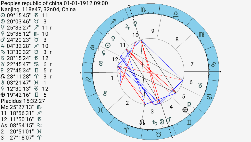 Tremendous symmetry between the two charts, but in reverse. PRC has Aquarius rising (not Leo), Moon Saturn Mars in Taurus but conjunct the IC, Venus in Scorpio conjunct the MC and conjunct Nancy’s Moon. Uranus passed over the Saturn (the chart ruler) on April 13th and will go over the Moon, Mars, IC, Venus, MC next year. China launched military exercises close to the island of Taiwan in response to what they saw as provocation.