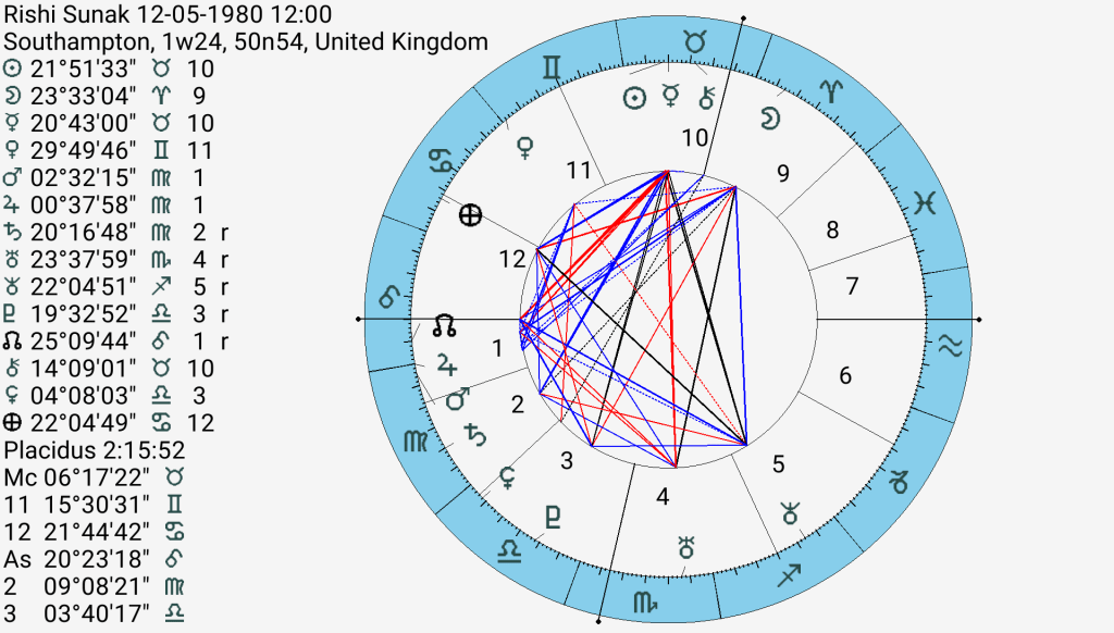 The first thing to notice, is she has an unaspected Sun in Leo, which is tough for the planets and sign which needs to shine and take centre stage. Truss comes over a diffident and confused, which makes me wonder if she is Cancer rising, (her deer in the headlights responses) with the Mercury/Saturn conjunction on her Ascendant. This would make her cautious, timid, but doggedly determined (Saturn). She also has a very emotional Moon is Pisces which again makes her over sensitive and perhaps a fantasist-she did dress up like Margaret Thatcher at one point (pussy-bow blouse, big handbag). But she also has that dogged and determined Mars in Taurus which digs its heels in and keeps on keeping on, probably ignoring the chatter from outside. Asked if she went to any of the lockdown parties she said no and admitted she was not invited to any of them, which seemed rather pathetic, revealing her to be a ‘Johnny no mates’ amongst the lad culture of no 10. Her feisty Jupiter in Aries will mean she is not afraid of the bully boys and she has vision and hope and optimism. She is expected to win the nomination. Her rival, Rishi Sunak, once the golden boy is trailing in the polls because of that other Taurean trait, greed.