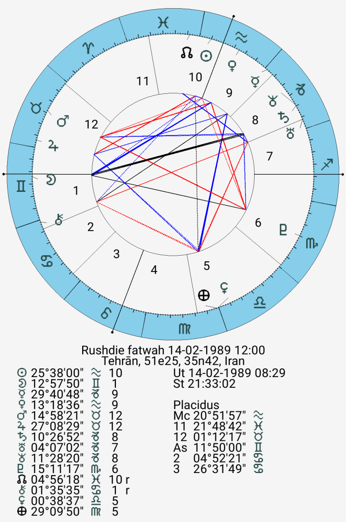 The 7th house shows open enemies and is ruled by Mars and perhaps Pluto. Mars is in the 1st in detriment in Taurus. Mars in Taurus is slow, plodding, but fixed on the goal, his enemies are determined, playing the long, slow game, and contemplating violence (Mars) Mars in Taurus suggests a beating, and his assailant did indeed rain blows down on his during the attack. Mars is opposite and equally weak Jupiter in Scorpio in the 7th house of his enemies. Jupiter rules the 8th of death and violence and the 9th house, publishing, as well as the 12th house of self undoing, arguably after so many years, Rushdie’s guard was relaxed. The Satanic Verses was published in 1988 and the fatwa was issued 14th February 1989 in Tehran by the Ayatollah Khomeini, no time is registered so I have drawn up the chart for 12.00.
