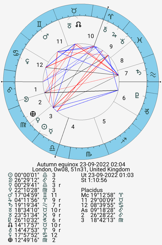 How does the government look in the Autumn Equinox chart? It is shown by the MC in Aries, ruled by a divided/duplicitous Mars in Gemini in the 11th. The new PM was elected by the membership of the Tory party (which can be seen as the 11th house of groups). She was sworn in three days before the Queen died, so Aries fits as the new broom. Mars is applying to a trine of Saturn in Aquarius, which rules the 5th and 6th houses.