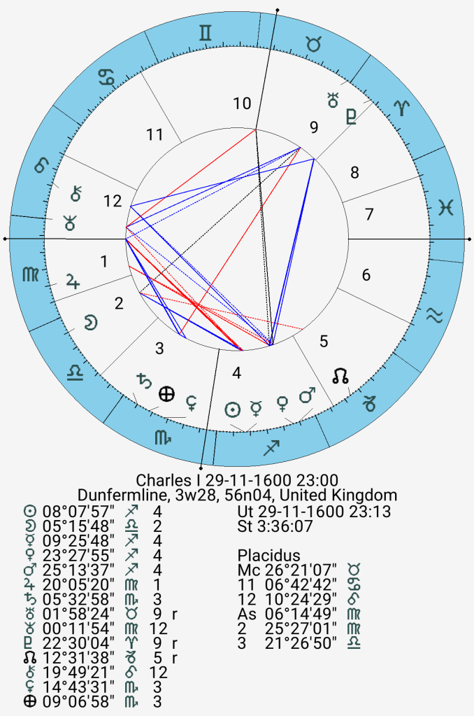 Sagittarius is the sign of the philosopher, guru and ideologue. Mars there makes the natives defend their beliefs with violence, bullying and passion. Charles I’s behaviour brought about the English Civil War in which an estimated 400,00 people were killed. Sagittarius is the spiritual warrior, arguably Charles I was one, however misguided.