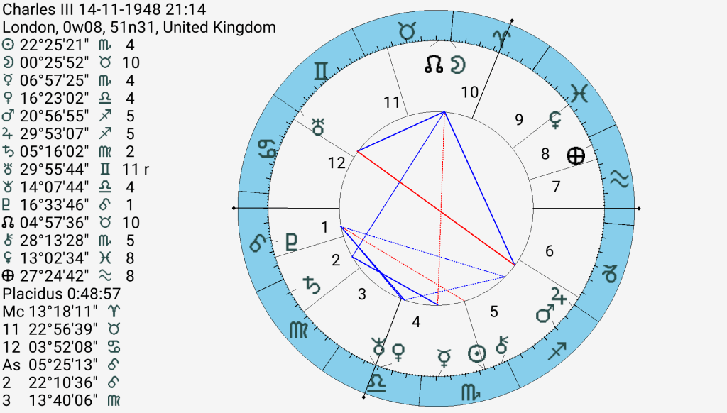 The Fixed star Acumen, 28’Sag 45 (orb 1′) (Charles III Jupiter, Harry Neptune) is of the nature of Mars and the Moon making the native adventurous, perfidious, insolent, wanton, brutal. If rising (Charles III) it gives trouble and loss through women, most definitely! If culminating, (Harry) it suggests disgrace and imprisonment. The former, surely (through the eyes of some people) the later remains to be seen! This description would fit more to Charles I, but his Mars at 25′ Sag was out of orb.