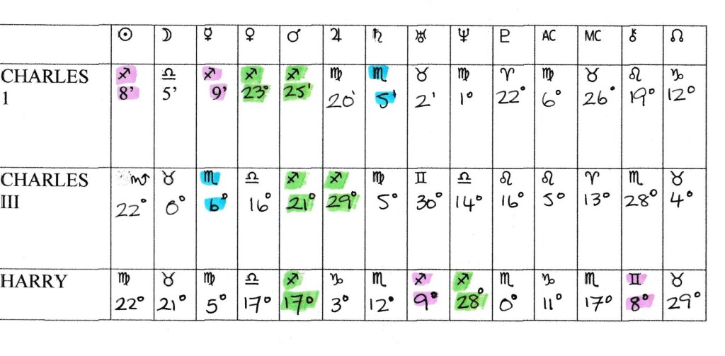 Charles I had a Venus Mars conjunction at 23′ and 25′ Sagittarius, Charles III has a Mars Jupiter conjunction in Sagittarius at 21′ and 29‘ degrees while Harry has Mars at 17′ degrees Sagittarius and Neptune at 28′ Sagittarius.