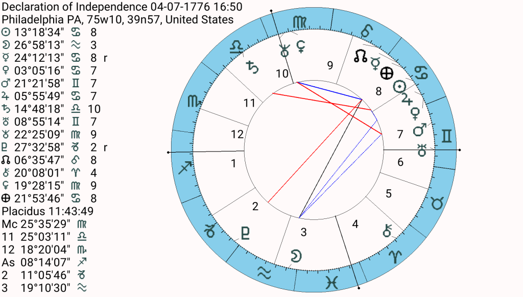 Mars at 21′ Gemini makes a wide Grand Air trine with Saturn at 15′ Libra and the Moon at 27′ Aquarius (I allow great orbs for large configurations). Moon in Aquarius is the home of the ideologue and as fixed air, it shows one who does not budge once its mind is made up. Saturn, exalted in Libra in the 11th shows brilliance of the US and their collective identity, ‘we the people’.