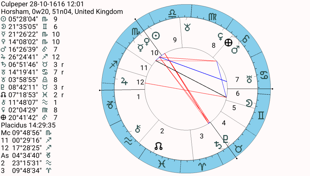 Culpeper’s books have never been out of print which is a record probably only matched by religious books. His strong Jupiter (which rules publishing) and his second house of money protected his legacy. We do not have an exact time for the event, but Jupiter was transiting at late Gemini and early Cancer during the period so it would have conjuncted his Moon at 22′ Gemini and opposed his Jupiter at 26′ Sagittarius. Neptune (which seems to pop up a lot in these stories) was opposite his Pluto at 9′ Taurus and Mars was conjunct his natal Neptune in early Libra (at least for the summer of 1634). Perhaps the Neptune transits are explained by Neptune’s natural rulership of the 12th house.