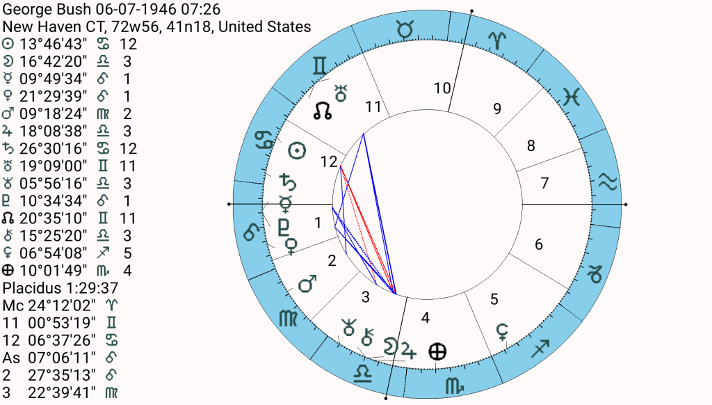 Bush and Blair both, for example, represented a new confidence in their respective countries and all was well for a while. Interestingly, both men prosecuted wars which arguably lead to their downfall. The Bushes also started un-winable wars in Kuwait, Iraq and Syria etc. The unbounded quality of the 12th house both embraces the collective and the archetypal very effectively but can also get lost and lose perspective and believe they are untouchable and manufacture their own downfall, which is a traditional reading of the 12th house, but to have a downfall you need a place to fall from, all of these people can be seen as highly successful yet flawed people.