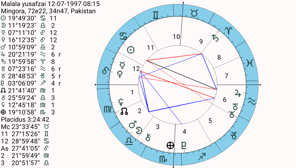 Malala was attacked on the 9th of October 2012. The gunman stopped the school bus and asked for her by name and said if she didn’t identify herself he would shoot everyone. The Moon that afternoon (the girls were returning from an exam) was at late Cancer traveling through her 12th house, and making the opposition to Neptune at 29′ Capricorn. She survived being shot in the face, the bullet lodged in her brain, perhaps Neptune made the gunman’s aim dodgy. Malala underwent long periods in hospital (12th house of seclusion) but miraculously survived and thrived earning at BA from Oxford. Her voice, that 12th house Mercury resonated with leaders around the world. Pakistani clerics issues a fatwa against her killer, she wrote a best selling book, set up a charity and won the Noble Peace prize. She spoke for women and girls worldwide and became the collective voice for them. Venus, the ruler of her MC showed how she used the attack to become a figurehead (MC) for girls (Venus) through her fame (Leo).