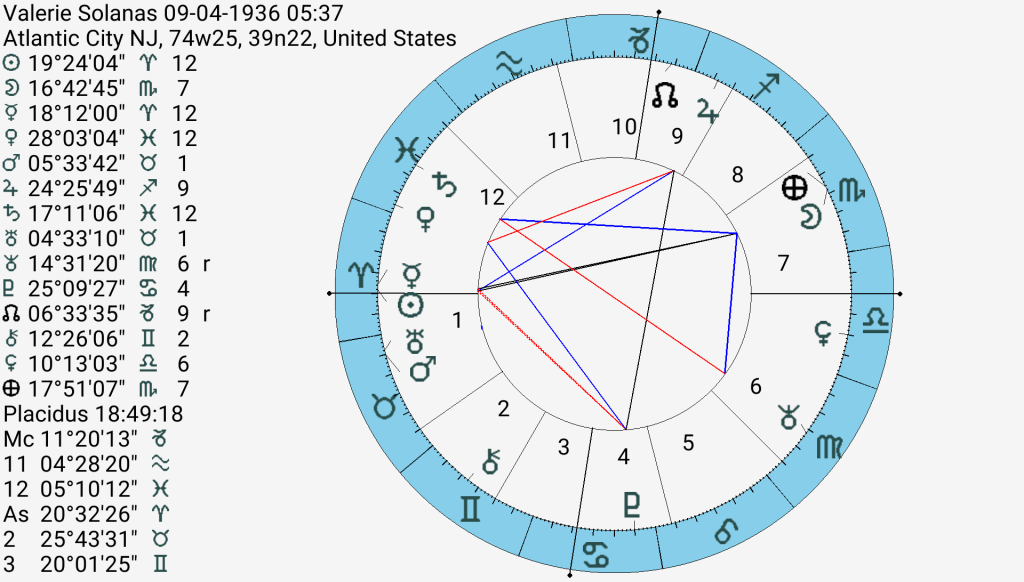 The Moon was traveling through Solanas’ 6th house that day, eventually squaring her Chiron at 12′ Gemini, conjuncting her Neptune at 14′ Virgo, opposing to her 12th house Saturn and squaring Jupiter at 24′ Sagittarius. This made Solanas notorious (unlike Malala) and she was subsequently incarcerated in a mental institution and died in obscurity. The Scum manifesto lives on however. Solanas is considered to have been the founder of the radical feminist movement which opposes the collusion of ‘mainstream’ feminism with the patriarchy. Solanas was writing until she died, but nothing survived, her mother burned all her papers. Her mother is also shown by the 12th house Saturn.