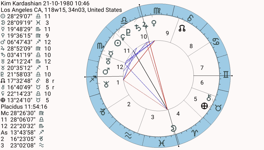 On that day Mars the aggressor was at 24′ Scorpio conjunct Taylor’s Mars/Ascendant at 25’/26′ degrees. This was a wound, an attack on her very self and particularly her image. ‘Bitch’ as a symbol for Mars in Scorpio, I think so! This Mars was also conjunct Kim’s Uranus, fighting back, aiming to destroy through technology (it was released on Snapchat) she claimed it was done to protect Kanye, but Kim’s Mercury at 19′ Scorpio is conjunct Taylor’s Pluto at 16′ so perhaps jealousy had a little more to do with it. Kim was trying to destroy (Pluto) a rival who arguably by then was more famous/richer and certainly younger than she was. Or even more prosaically, Kim did it for her own publicity/career motives (Mercury rules her MC). All publicity is good in the world of reality TV.