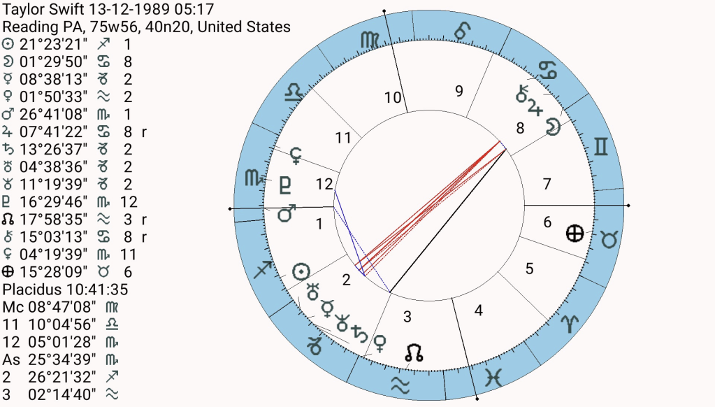 As we don’t have the exact time, the Ascendant and MC may not be correct, however notice combative Aries rising and Mars weak in Cancer conjunct the IC shaking those foundations. Mars, at 12′ Cancer is conjunct Taylor’s Chiron and opposite Taylor’s stellium in Capricorn.This is an attack on her career (Mercury in Capricorn ruling her MC) in public. One thing Capricorn hate is public shaming and this was a humiliation in front of an estimated 9 million people.