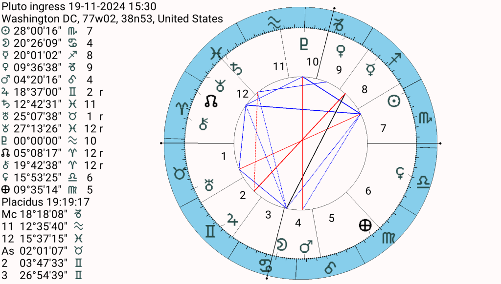 The Moon, signifying the people, is in its sign, Cancer. It has more dignity and power than the government, which is shown by Saturn weak in Pisces. This may show a government of old men as Saturn rules old age. Remember in the 1777 chart Mercury was peregrine in Pisces, Saturn also has little dignity in that sign. The government is weak and has lost its power. The Moon is separating from a square of Chiron at 19′ Aries. Chiron, the wounded healer, is in the 12th house of karma and self-undoing. I believe this harks back to the 1777 chart and the Revolutionary Wars, the Civil War and the ongoing civil strife, particularly with the descendants of slavery and genocide. The Moon applies to a sextile of Uranus in the 1st house. The people want change, something radical (Uranus), they are sick of the old wounds. Moon in Cancer wants peace, to be a big family, to be kind and gentle, to care for one another.