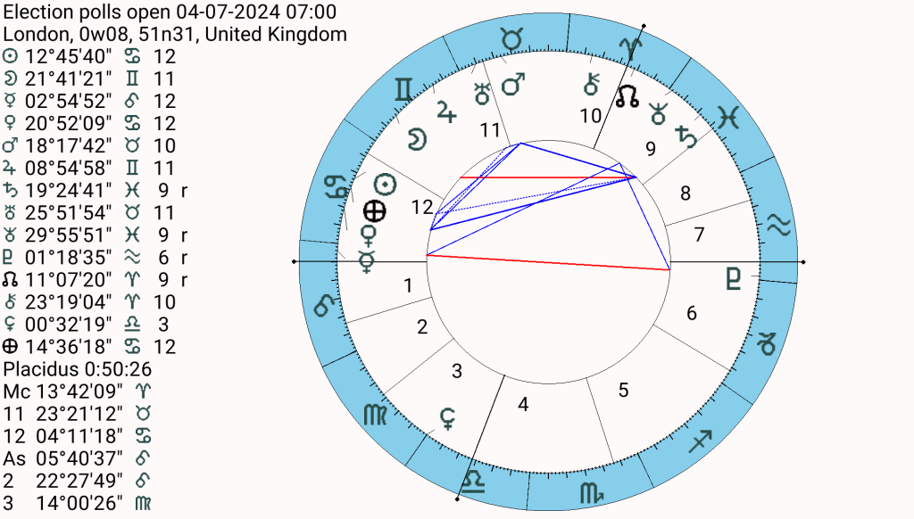So, what does the election chart suggest? The government is shown by the MC in Aries ruled by Mars in detriment in Taurus. The opposition leader is shown by the 7th house and its ruler, (open enemies) and that is both Saturn in Pisces in the 9th and Uranus in Taurus in the 10th. Saturn is also without dignity in Pisces. I feel this describes both men accurately, damp squibs, with little charisma or dignity. And what of the people, they are shown by the Moon in Gemini in the 11th house, which is also without dignity. The people are divided and underwhelmed. Interestingly, Mars is applying to a sextile of Saturn, is this Rishi handing over the reins of power? Probably. The Moon is applying to a sextile of Chiron in Aries in the 10th house and then a square to Neptune in Pisces in the 9th house. The 9th house rules lawsuits, I wonder if there will be some confusion or legal challenges over the ballot. The Moon in an event chart shows what happens next. I feel both leaders may suffer a bloody nose, Rishi due to the failure of 14 years of government and Starmer as fallout from his stance on Gaza.