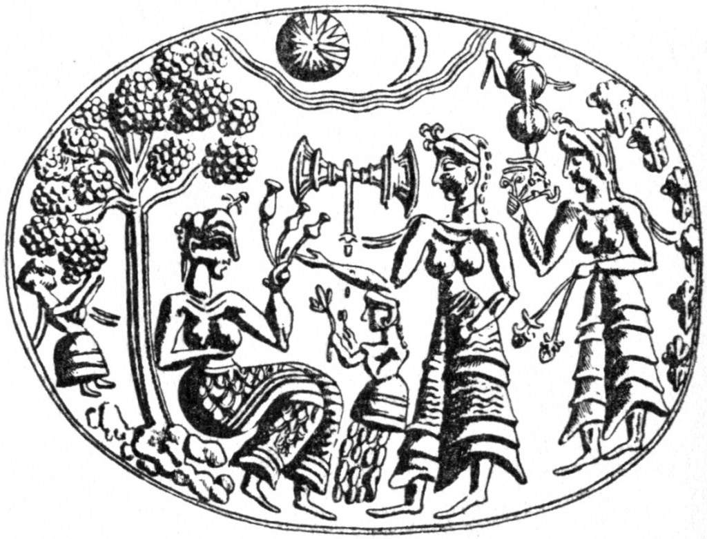 Drawing of the motif of a gold ring from Mycenae depicting a goddess (possibly a proto Demeter) holding three poppies, in the background a labrys (double axe) c 1400-1200 BCE.