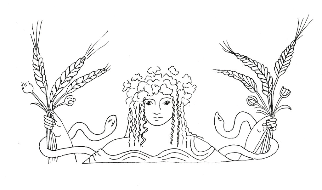 Demeter’s journey does not end there. When the child’s mother, spying on the goddess, sees her holding the child in the fire she cries out. And the goddess, annoyed, reveals her whole magnificent divine self. The women of the palace gather and throughout the night Demeter teaches them her Mysteries. In the morning, the men are summoned and instructed to build a temple to Demeter.