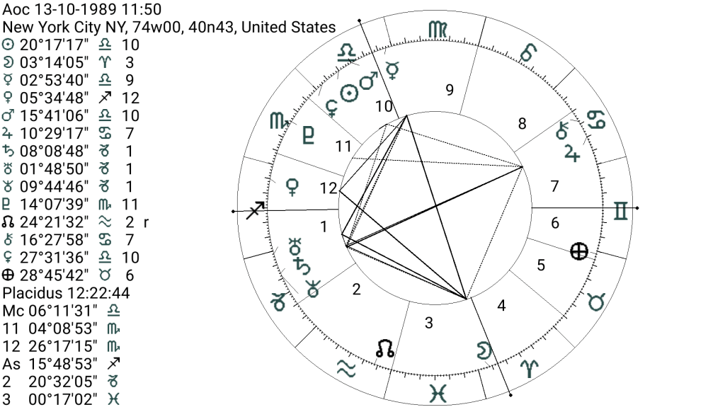 AOC has a Cardinal Grand Cross in the angular houses, so this is a chart of someone who will be in the public eye (1st and 10th houses) and break the mold (4th house). Her strong Mercury in Libra is conjunct her Libra MC and is opposing that radical, feisty, fearless Moon in Aries conjunct the IC. Both are square the Uranus, Saturn and Neptune conjunction in Capricorn (the sign of government) in the 1st house of public recognition. Saturn in its own sign gives power, fine intelligence and sure footed ambition to navigate the corridors of power. These planets are opposite the 7th house exalted Jupiter in Cancer, widely conjunct Chiron at 16′ degrees, which brings the Sun and Mars into the Grand Cross at 16′ and 20′ Libra respectively.