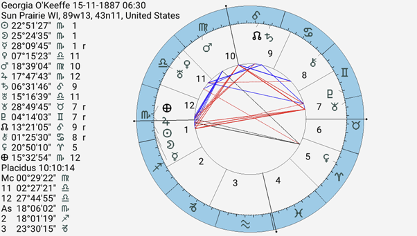 Georgia O’ Keeffe is the archetypal Scorpio. Sun, Moon, Mercury, Ascendant, Jupiter and the Part of Fortune all crowded around her Ascendant and opposite a painterly Neptune in Taurus and Venus in Libra. She took nature (Taurus, Kore) and transformed it into something deeper, darker and more confronting.