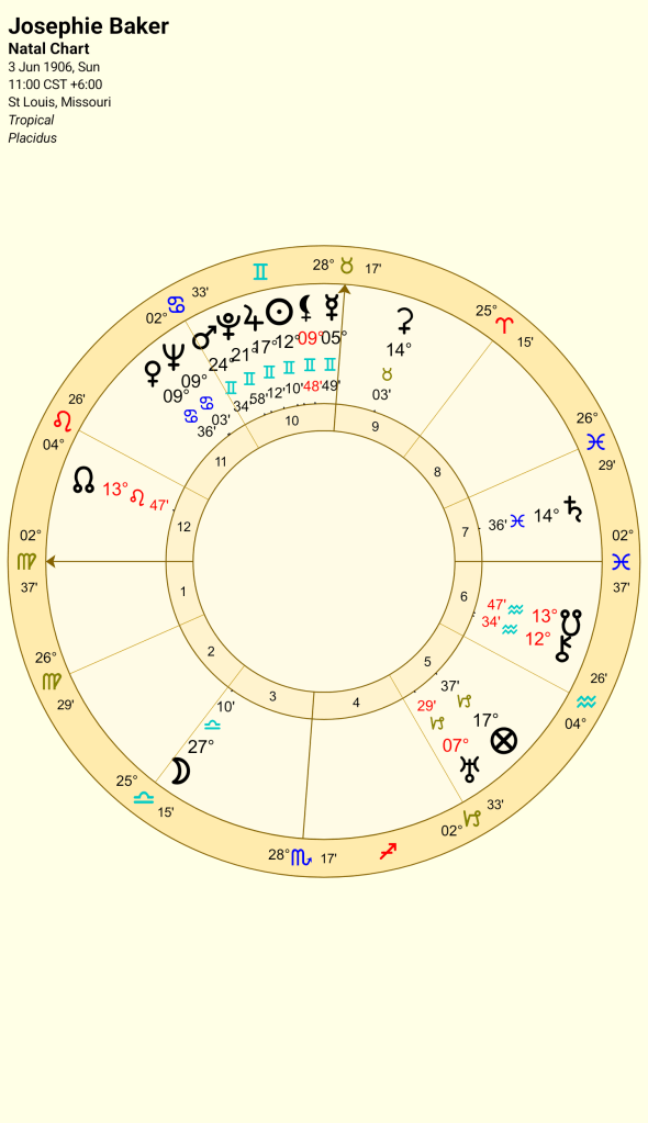 Josephine Baker had Lilith conjunct Sun and Mercury, in her stellium in Gemini in the 10th. Best known for her dance, she was a spy for the Free French (classic Gemini) and a comrade of MLK and others in the NCCP. Gemini gave her Lilith an even greater voice, she fought her battles against racism and fascism, with a light touch Gemini energy. You can read a longer version on a blog post here. or in Goddess Astrology here