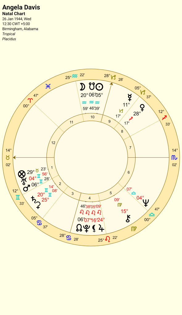 Angela Davis, author of Women, Race and Power is an American academic, radical feminist and political activist. Lilith in Leo demands respect and an audience, placed midway between Jupiter and Pluto and North Node in her fourth house, opposite her Sun Moon conjunction in Aquarius shows how rebellion, together with great intelligence, demands the world listen. Like Grace McGowan, she criticised men in the Black Power Movement for not standing up for black women, claiming feminism was the bedrock of any revolution. The Jupiter conjunction in marvelous Leo gave her luck and support from the powerful which protected her and ensured she won her battles.
