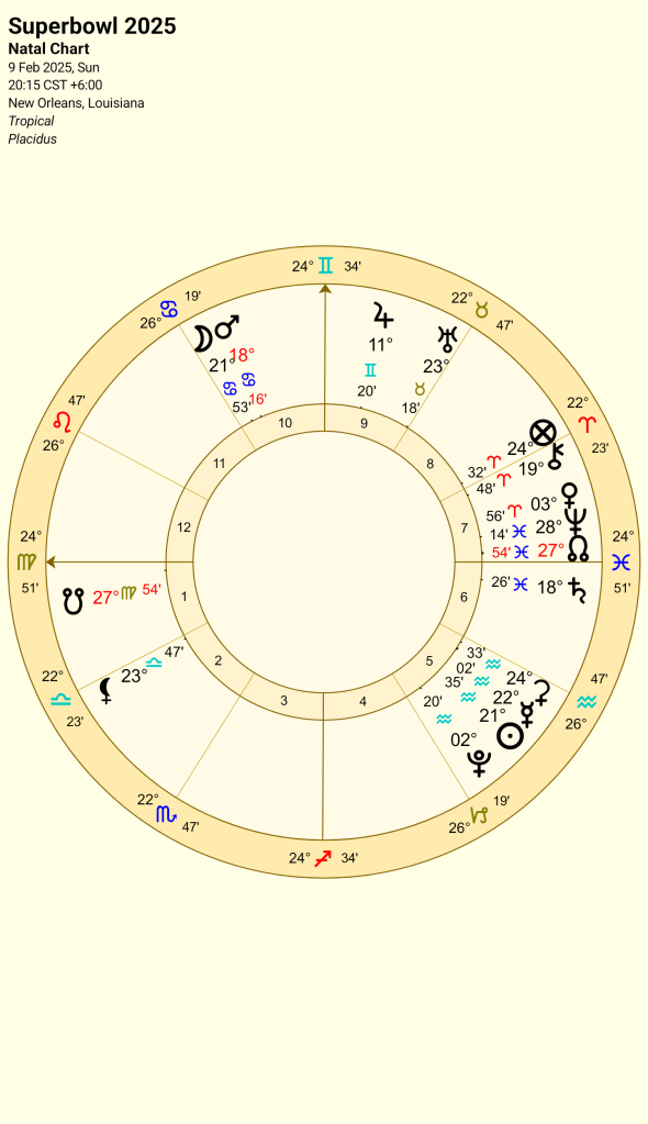 But back to the Moon. Often in mundane astrology the Moon is the trigger point to an event. The Full Moon was three days later, on Wednesday, 12th of February. Now, normally I would say the effects of lunations last two and a half days before and afterwards, and this is three days. However, there was the event, at the Superbowl and the effect which rippled out of the world of rap and American football into everywhere else. My Instagram feed was practically nothing else for at least a week afterwards. People were explaining the symbolism of the show, his words, the people, the music, to outsiders like me. The more it was explained the more radical the whole show became. This, at a time that American ‘democracy’ was being systematically undermined by 47 and his ‘First Lady Elon’.