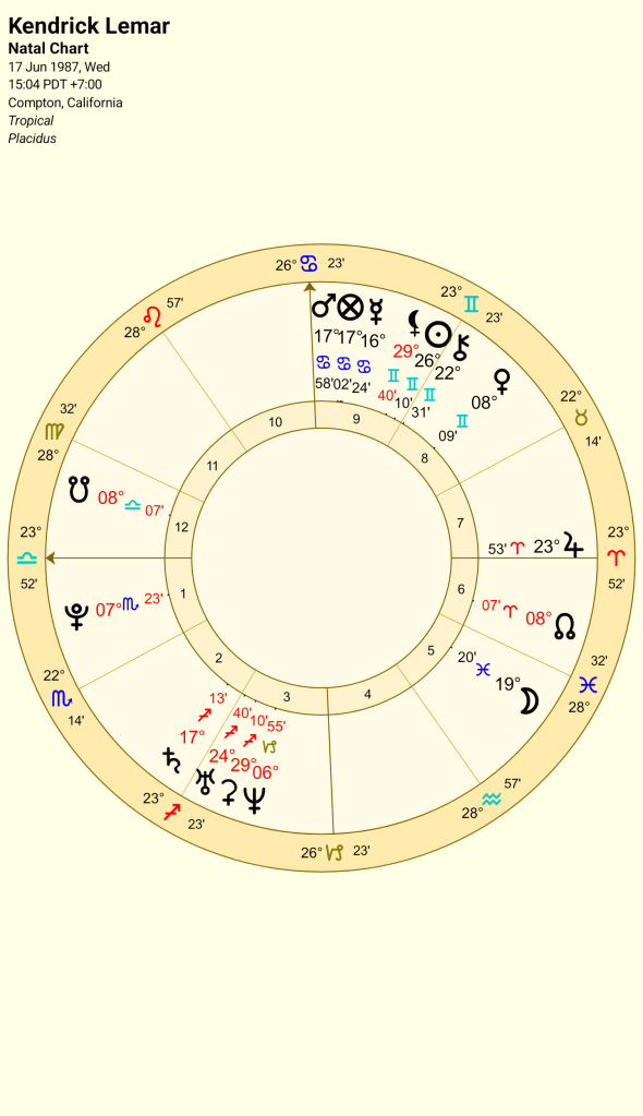 Kendrick has a wide Grand Trine in water; Moon in Pisces in the 5th house, Venus, Mercury, Part of Fortune and Mars in Cancer in the 9th house and Pluto in Scorpio in the first house. Water is the creative, feeling-full element, often found in musicians and poets. He also has talked about his mental health struggles, breaking a big taboo among rappers.