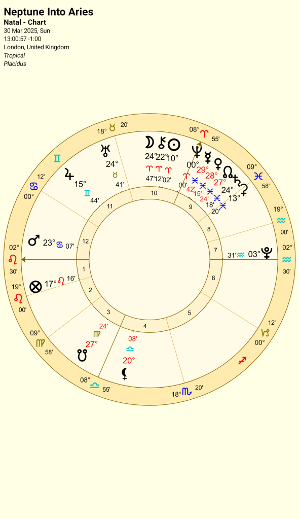 Last week, Neptune the planet of illusions and delusions moved into Aries. Neptune changed signs last in February 2012. Neptune spends around 15 years in each sign, it will leave Aries in 2039. So, that is half a generation, usually calculated at around 28 years.