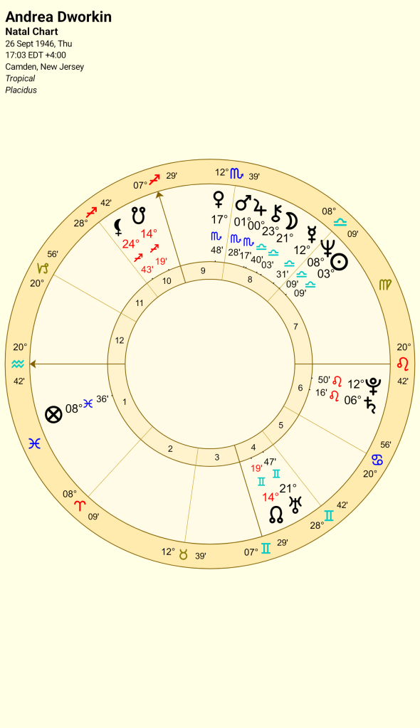 Like MTG, Andrea had a Mother-wound, in this case Moon conjunct Chiron (MTG had Venus) and they both had aspects to Uranus, which I consider to be a planet of violence. But in Andrea’s case Uranus trines her Moon, a softer aspect, Uranus also rules her Ascendant (with Saturn) so her relationship with violence is writing about it (Libra) in a radical way (Uranus). Her other books include, Pornography and Intercourse which she compared to rape. Notice Saturn Pluto conjunction in Leo, (Pluto is often associated with sexual abuse) trine Mars, Jupiter conjunction in Scorpio, (sex, power, the taboo). Saturn, co-ruler of her Ascendant conjunct Pluto shows her body (Ascendant) did not belong to herself (Pluto). She wrote that she was raped twice.