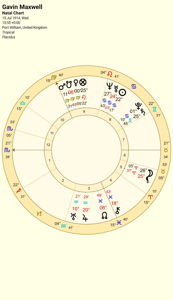 He had a stellium in Cancer in the 8th house, Sun, Mercury, Neptune conjunct and Pluto out of orb. Their synastry, her Venus conjunct his stellium would be a meeting of souls. Venus Neptune contacts are incredibly romantic but may also bring illusion, delusion and perhaps a little madness. Certainly, there would have been high emotions, drama and mood swings. There was a more sombre synastry, Kathleen’s Sun, Pluto conjunction in Gemini, (combustible, words of power) is conjunct his wide Saturn Pluto conjunction in his 8th house. Notice the ruler of Maxwell’s 8th house is Mercury, words then, might be the death of him.