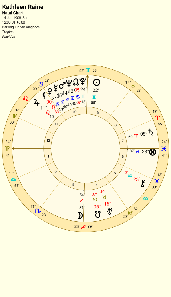 Kathleen had a tempestuous love life and certainly fitted the picture of the passionate poet. We do not have her time of birth, but she had a stellium in Cancer, (North Node, Neptune, Mars, Mercury, Venus) , her feelings would be intense (Venus, Mars, Neptune) and powerfully expressed through words (Mercury).
