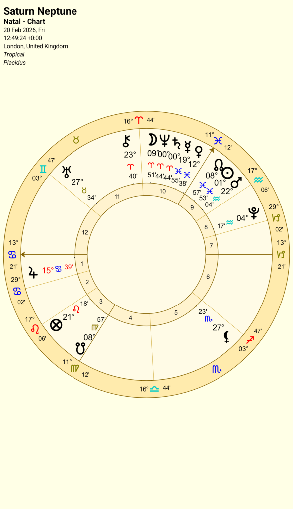 This is the chart for London for the Saturn Neptune conjunction at 0’44 Aries. The Moon would have recently passed over the planets and now stands at 9’51 Aries. There is a stellium in the 10th house of government (and Kings), Venus Mercury in Pisces and Saturn Neptune and the Moon in Aries.