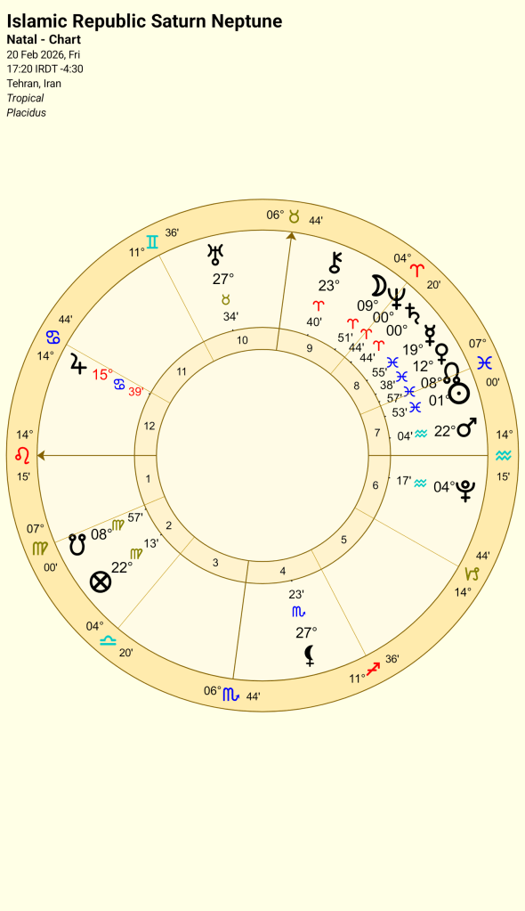 - for a discussion as to which is correct chart for the Islamic Republic see: https://astrologyking.com/iranian-horoscope/ ↩︎