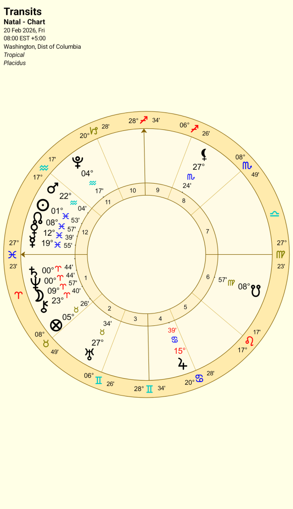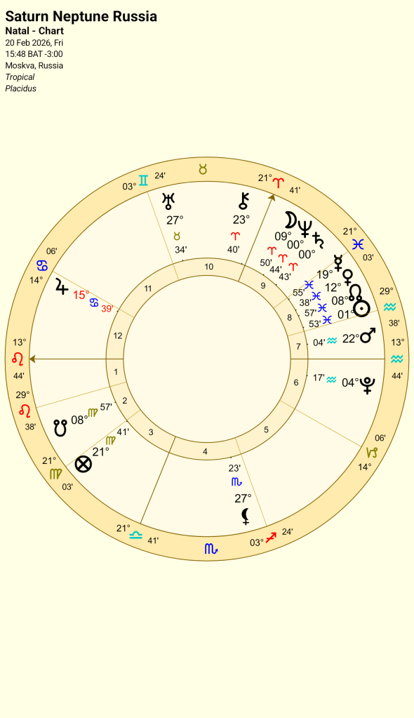 What of Russia? Russia has the Saturn Neptune in the 9th house of law and foreign adventures. With Saturn ruling the 6th, 7th and 8th houses and Neptune ruling the 9th house. You may remember from the previous post, Saturn Neptune for Russia has shown times of turmoil, regime change and revolutions, both violent and peaceful. The chart ruler, the Sun is weak in Pisces in the 8th house of death and debts. It is believed that the Russian economy is struggling due to the expensive war with Ukraine and to date it is estimated that the Russian death toll may be as high as 352,000, an unsustainable number. The people, Moon in the 9th are generally behind the war. The leadership shown by Mars in Aquarius in the 7th, suggests they are working with allies (7th house) or open enemies. Notice Chiron conjunct the MC (2 degrees away) which suggests, like the other two charts (UK and USA) the leadership is damaged, although for the UK and USA Jupiter will turn direct ( March 11th 2026) and become powerful again, while Chiron on the MC for Russia suggests it may be fatally wounded and will not repair (Chiron), history (see previous post) supports this.